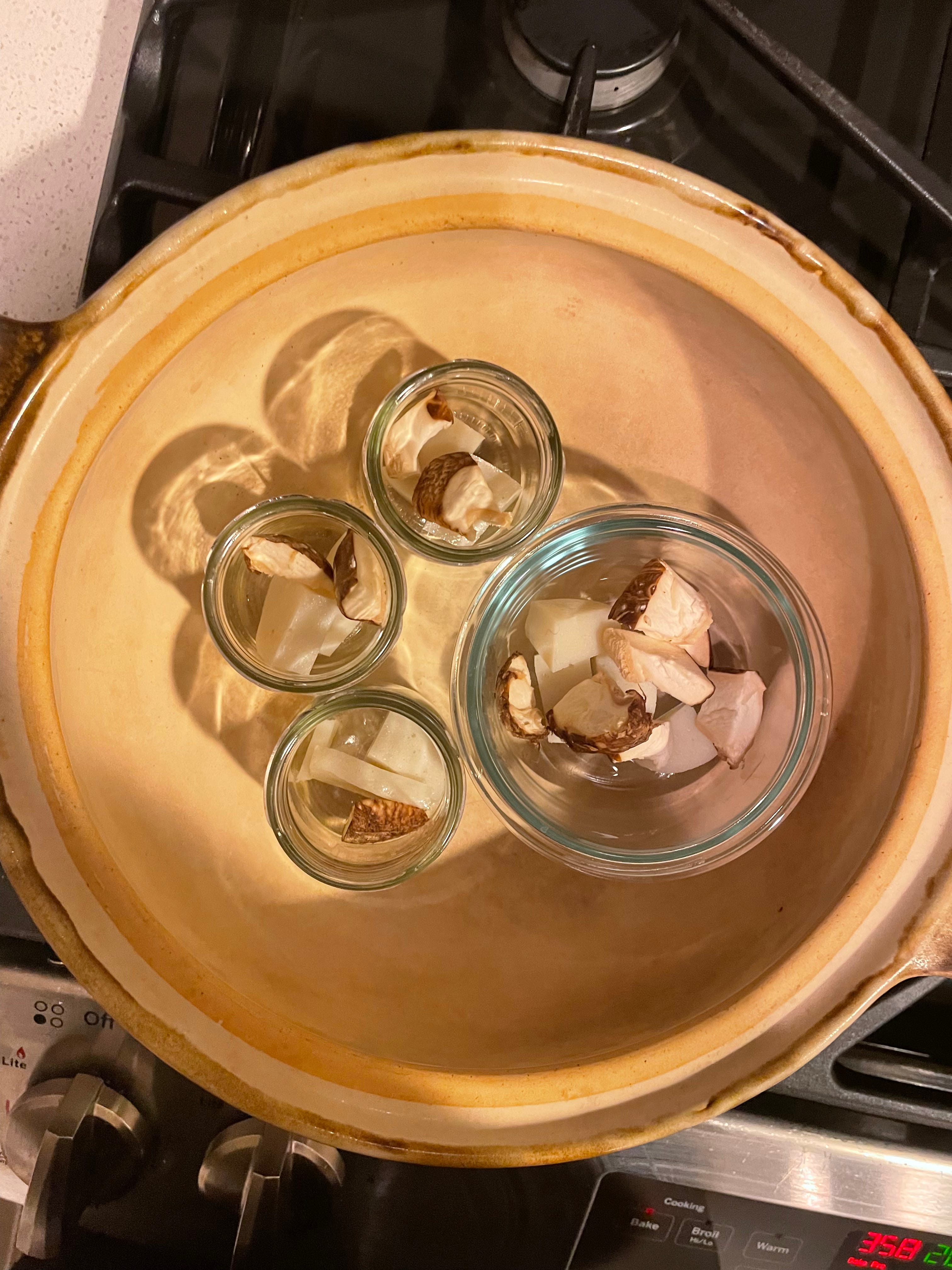 I put my cups into my donabe (I have tried this with my Le Creuset but the heat retention was so good that I overcooked them!) and fill the pot about 1/3 of the way with boiling water. Official recipes will instruct you to cover the cups with aluminum foil, but I never have any on hand and my chawanmushi has never suffered. So I’d say skip it.