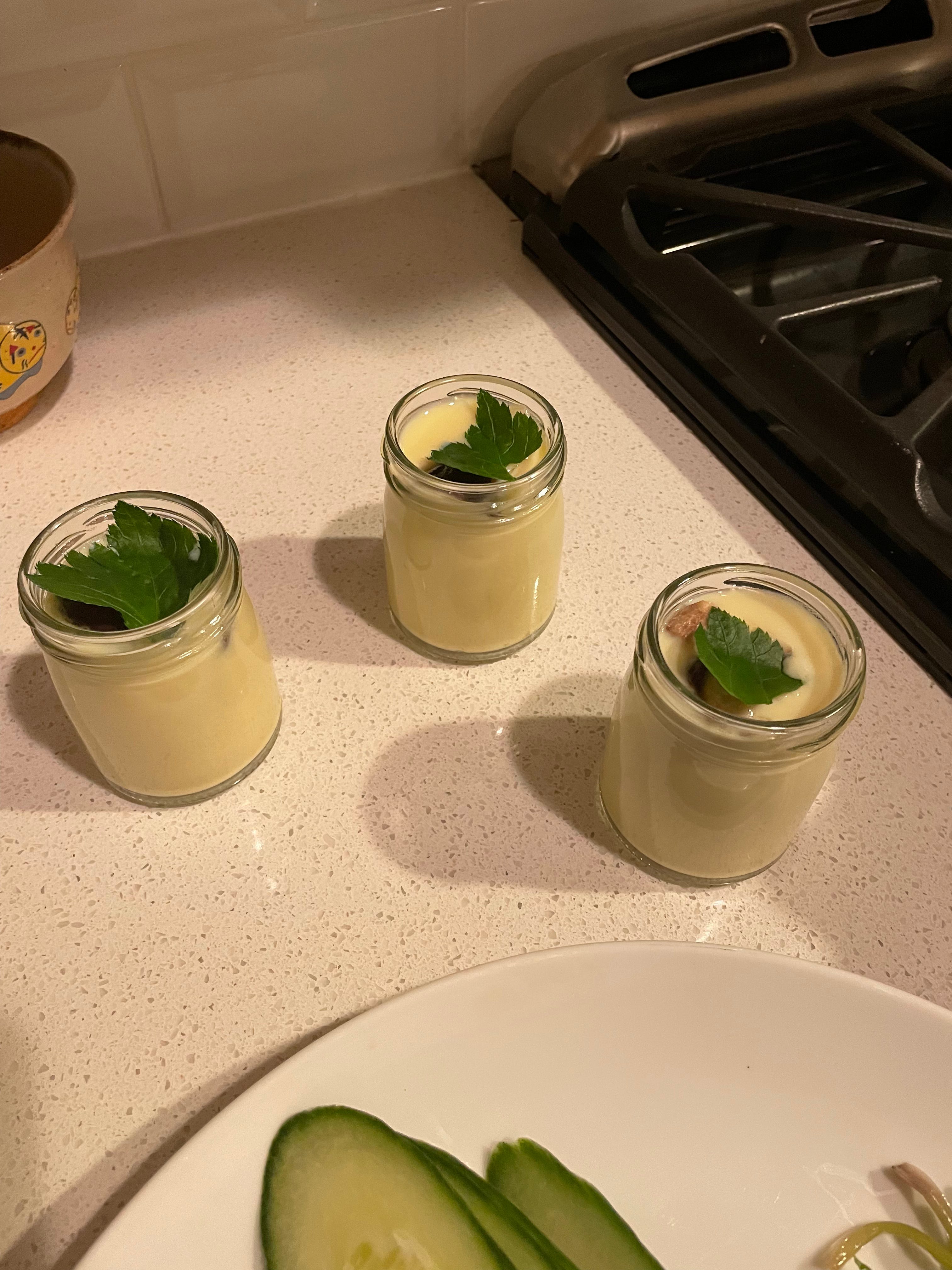 Steam for 20-25 minutes on low heat (you can take a peak at the 15 minute mark. There should be just a little bit of shimmy when you wiggle the ramekin). Top each chawanmushi with a little bit of mitsuba.